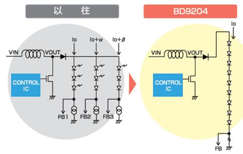 在液晶電視LED背光方面,Rohm新發(fā)布的BD9204F背光驅(qū)動(dòng)器能驅(qū)動(dòng)90×3列共270顆LED燈芯,從而非常適合LCD TV背光的應(yīng)用。福田明介紹,作為大型LCD背照光技術(shù),其關(guān)鍵點(diǎn)是列之間的亮度偏差以及一般由PWM進(jìn)行調(diào)光。在大型LCD上適用LED背照光的情況下,各LED列的LED電流偏差會(huì)使LCD板面所產(chǎn)生的亮度不均勻。對(duì)于這個(gè)問(wèn)題,Rohm公司通過(guò)導(dǎo)入獨(dú)有的電路技術(shù),將各LED列的電流匹配偏差控制在±1.5%以內(nèi),即使是大型LCD適用了LED背照光的情況下,也不會(huì)發(fā)生LCD板面亮度不均勻的現(xiàn)象。
