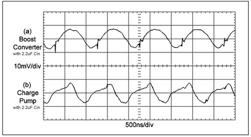 圖5.如果開關(guān)頻率為1MHz,驅(qū)動同樣數(shù)量的LED,采用相同的輸入電容,那么電荷泵(b)和升壓轉(zhuǎn)換器(a)的輸入紋波基本相同。然而,由于電荷泵與LED之間有較多引線,建議使用更短的連線(天線),另外,泵電容產(chǎn)生的EMI低于升壓轉(zhuǎn)換器的電感。