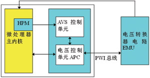 自適應(yīng)電壓調(diào)整AVS基于跟蹤系統(tǒng)處理器的性能變化,由嵌入式自適應(yīng)先進(jìn)電源控制器(APC)做出自適應(yīng)電壓調(diào)整。APC通過(guò)PowerWise接口將系統(tǒng)處理器的性能(頻率)、溫度變化準(zhǔn)確地傳遞給外部自適應(yīng)電源管理芯片。然后,該電源管理單元根據(jù)性能需求自動(dòng)調(diào)整供給系統(tǒng)處理器的電壓,使處理器運(yùn)行在能確保應(yīng)用軟件正確運(yùn)行的最低電壓和頻率下。DVS和AVS的核心是先進(jìn)電源控制器(APC)。圖2為AVS的原理框圖。
