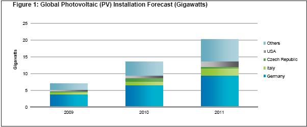 圖1所示為iSuppli公司對(duì)2009-2011年全球光伏裝機(jī)容量的預(yù)測(cè)。