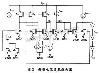 靈敏放大器的工作目的是通過放大位線上微小信號(hào)的變化而讀取存儲(chǔ)單元中的數(shù)據(jù)。一般可以分為電流型靈敏放大器和電壓型靈敏放大器兩種。由于電流靈敏放大器直接探測(cè)輸入電流的變化,可以克服電壓型靈敏放大器速度較慢、低工作電壓下小信號(hào)電壓增益減少等缺陷,因此電流靈敏放大器受到越來越多的關(guān)注。