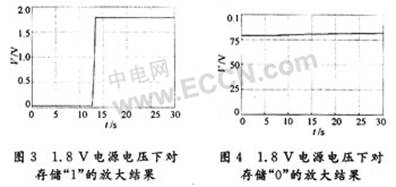 圖4為靈敏放大器在1.8V電源電壓在室溫條件下對(duì)存儲(chǔ)信息“0”放大的仿真圖形。從仿真結(jié)果可以看出,輸出電壓有微小的變化,但是在整個(gè)過程中輸出電壓都低于0.1V,都在低電平范圍內(nèi)。這說明該電流靈敏放大器在室溫情況下能對(duì)存儲(chǔ)信息“0”進(jìn)行可靠讀取。