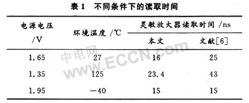 表1是該電流靈敏放大器在不同電源電壓和環(huán)境溫度下的讀取時(shí)間。從表1中可以看出在較低電源電壓和惡劣環(huán)境下該電流靈敏放大器仍然有比較好的性能。表1還把本文的電流靈敏放大器的仿真結(jié)果與參考文獻(xiàn)[6]所仿真的結(jié)果進(jìn)行了對(duì)比,可以看出在本文所設(shè)計(jì)的電流靈敏放大器在某些情況下有更快的讀取速度。