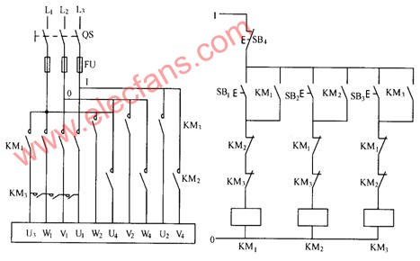 顯然,這套線路任何一種速度要轉(zhuǎn)換到另一種速度時,必須先按下停止按鈕,因為三個接觸器之間是電氣互鎖的。