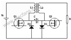 功率雙向流動(dòng)CUK變換器(圖2)與傳統(tǒng)的單向功率流動(dòng)CUK變換器不同的是:在原來(lái)開關(guān)管Q1和二極管D1兩端分別反向并聯(lián)二極管D2和開關(guān)管Q2如圖3所示。這個(gè)電路具有對(duì)稱性,輸入輸出電流方向可正可負(fù)。右邊負(fù)載R換為下正上負(fù)電壓源Vs,左邊電壓源Vs換為負(fù)載R,則功率從右向左倒流[2]。