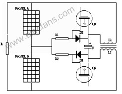 系統(tǒng)投入運(yùn)行后,假設(shè)Ua>Ub,電壓環(huán)比例積分調(diào)節(jié)器的輸出高電平封鎖Q2的驅(qū)動(dòng)電路,TL494的調(diào)制脈沖輸出端A(8腳)輸出PWM方波無(wú)效,只有Q1導(dǎo)通,功率從PANEL A流向PANELB,Ua下降,Ub上升,最終Ua=Ub。反之,Ua<Ub,電壓環(huán)比例積分調(diào)節(jié)器的輸出高電平封鎖Q1的驅(qū)動(dòng)電路,TL494的調(diào)制脈沖輸出端B(11)腳輸出PWM方波無(wú)效,只有Q2導(dǎo)通,功率從PANELB流向PANELA,Ua上升,Ub下降,最終亦Ua=Ub。
