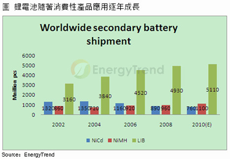 Energy Trend 表示,在消費性產品領域的二次電池領域中,鎳鎘電池的歷史最為悠久,但是因為在材料環(huán)保方面,受到質疑,包括歐洲地區(qū)在內的一些先進國家,限制鎳鎘電池僅能在醫(yī)療以及軍事等特殊用途使用。至于鎳氫電池的使用上,過去普遍使用在數(shù)字相機等消費性產品上面,但是隨著產品訴求逐漸朝向輕薄發(fā)展,使得鎳氫電池的市占率逐漸縮小。