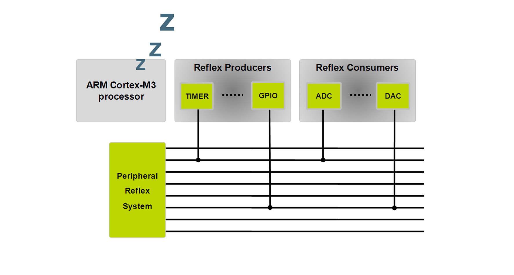 圖4使用一個(gè)互連矩陣或外圍設(shè)備反射系統(tǒng)可以執(zhí)行簡(jiǎn)單的任務(wù)如開(kāi)始數(shù)據(jù)轉(zhuǎn)換和存儲(chǔ)結(jié)果,完全無(wú)需喚醒32位處理器內(nèi)核。