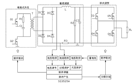 本逆變器輸入端為汽車蓄電池(+12V,4.5Ah),輸出端為工頻方波電壓(50Hz,220V)。其系統(tǒng)主電路和控制電路框圖如圖1所示,采用了典型的二級(jí)變換,即DC/DC變換和DC/AC逆變。12V直流電壓通過(guò)推挽式變換逆變?yōu)楦哳l方波,經(jīng)高頻升壓變壓器升壓,再整流濾波得到一個(gè)穩(wěn)定的約320V直流電壓;然后再由橋式變換以方波逆變的方式,將穩(wěn)定的直流電壓逆變成有效值稍大于220V的方波電壓,以驅(qū)動(dòng)負(fù)載。為保證系統(tǒng)的可靠運(yùn)行,分別采集了DC高壓側(cè)電壓信號(hào)、電流信號(hào)及蓄電池電壓信號(hào),送入SG3525A,通過(guò)調(diào)整驅(qū)動(dòng)脈沖的占空比或關(guān)斷脈沖來(lái)實(shí)現(xiàn)電壓調(diào)節(jié)、過(guò)流保護(hù)及欠壓保護(hù)等功能。