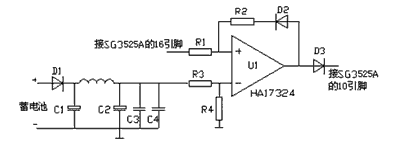 如圖5所示,D1為蓄電池極性反接保護(hù)。SG3525A的引腳16輸出參考電壓5V,取R3=R4=10kΩ。在正常情況下,U1的反相輸入端電壓大于正向輸入端電壓,U1輸出低電平,二極管D1、D2截止。當(dāng)蓄電池電壓低于10V時(shí),比較器U1開始工作,輸出由低電平變?yōu)楦唠娖剑珼2、D3導(dǎo)通,并把同相輸入端電位提升為高電平,使得U1一直穩(wěn)定輸出高電平,向SG3525A的引腳10輸出關(guān)斷信號(hào)。
