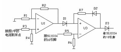 如圖6所示,運(yùn)放U2及外圍電阻構(gòu)成反比例放大器,運(yùn)放U3及外圍電路構(gòu)成比較器。圖1中的R3為取樣電阻,取2.2Ω,2W。當(dāng)負(fù)載電流增大時(shí),該電阻的壓降△U增大。