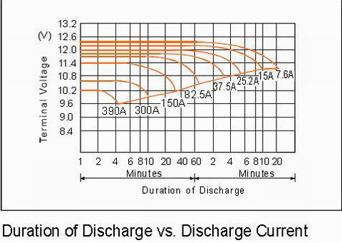 上圖是蓄電池生產(chǎn)廠家提供的150AH/12V蓄電池放電曲線。在實(shí)際使用時(shí)根據(jù)不同的負(fù)載電流選定不同的放電終止電壓。在該放電曲線中,以10小時(shí)放電和5小時(shí)放電曲線為例,對(duì)于10小時(shí)放電(負(fù)載電流為15A)來(lái)說(shuō),如果放電到終止電壓11V(44V),此時(shí)蓄電池放出的容量大約為100%。一般情況下,為了保護(hù)蓄電池盡量避免其深度放電,放電深度最好≤80%,終止電壓在46V左右,放電時(shí)間約為8小時(shí)。對(duì)于5小時(shí)的放電率來(lái)說(shuō)(負(fù)載電流為25.2A),終止電壓10.8V(43.2V)放出100%容量,在實(shí)際使用時(shí)放電深度≤80%,終止電壓在45.6左右,放電時(shí)間為4小時(shí)。