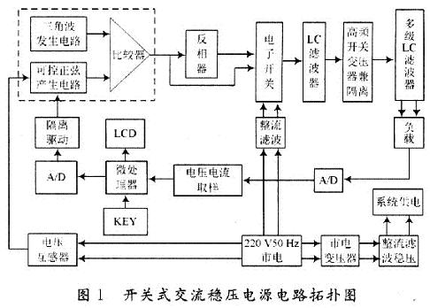 電壓和電流取樣電路從負(fù)載上獲取電壓和電流信號(hào),分別送兩路A/D轉(zhuǎn)換器轉(zhuǎn)換,變成離散的數(shù)字信號(hào)。一方面用于通過(guò)微處理器處理后進(jìn)行實(shí)時(shí)顯示;另一方面用于通過(guò)微處理器處理后送D/A轉(zhuǎn)換器變換為模擬量,經(jīng)過(guò)光電隔離驅(qū)動(dòng)電路來(lái)控制正弦波發(fā)生器的幅值,又經(jīng)過(guò)比較器、反向器、高速電子開(kāi)關(guān)、LC濾波、高頻開(kāi)關(guān)變壓器、多級(jí)LC濾波等電路,用于控制負(fù)載上電壓或電流的穩(wěn)定。電壓互感器的作用是從市電中獲得低諧波失真的標(biāo)準(zhǔn)正弦波,經(jīng)由正弦波產(chǎn)生電路控制其幅值;鍵盤(pán)用于輸入準(zhǔn)備向負(fù)載提供的電壓或電流值。
