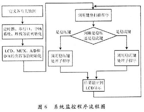 軟件部分的設(shè)計(jì)包括A/D轉(zhuǎn)換器、D/A轉(zhuǎn)換器、LCD顯示器、鍵盤(pán)系統(tǒng)等功能的子程序,還包含系統(tǒng)監(jiān)控程序和各種中斷服務(wù)程序等,其系統(tǒng)監(jiān)控程序流程圖如圖6所示。