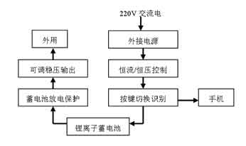 從手機(jī)鋰離子二次電池的恒流/恒壓充電控制出發(fā),用220V交流電通過配置的內(nèi)置儲(chǔ)能鋰電池對手機(jī)鋰離子電池充電。電路的具體工作流程如圖1所示。