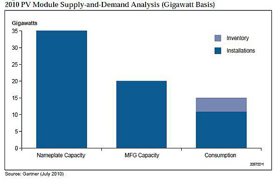 據(jù)市場調(diào)研公司Gartner表示,光伏組件制造商所聲稱的”售罄”情形及生產(chǎn)設(shè)備滿負(fù)荷運(yùn)轉(zhuǎn)的情形,與光伏組件實(shí)際的生產(chǎn)供應(yīng)情況極為不符。Gartner表示,光伏組件的實(shí)際生產(chǎn)供應(yīng)量約為20GW至24GW,而2010年預(yù)計新增安裝量僅為11GW多一點(diǎn)。由于兩個數(shù)據(jù)并不相互吻合,因此,Gartner擔(dān)憂市場將無法達(dá)到供需平衡。