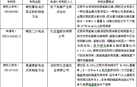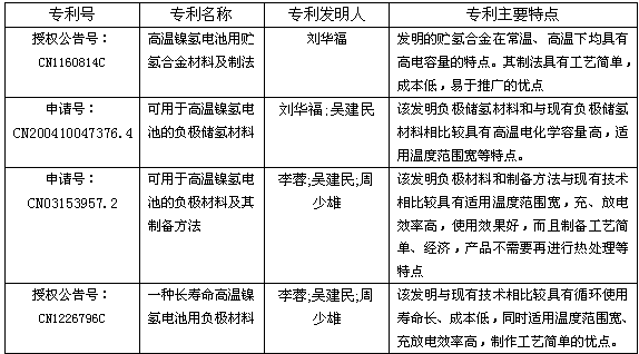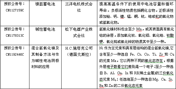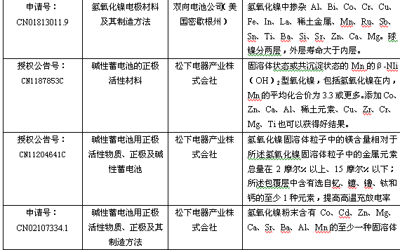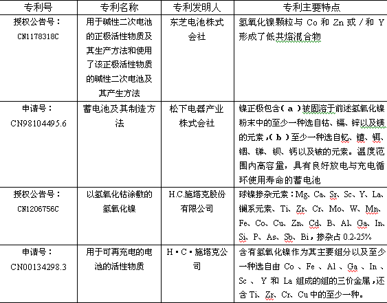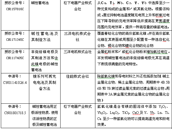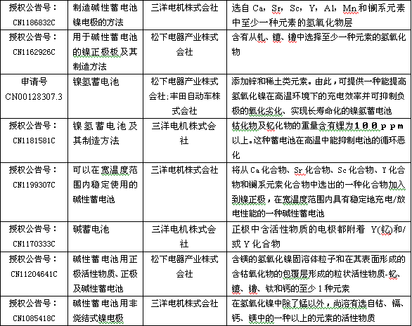 在電池配料時(shí),通過機(jī)械混合法添加周期表中ⅡA、ⅢB、ⅣB、ⅦB、ⅧB、ⅡB主族元素和3、4、5周期的元素、氧化物或氫氧化物,能較好地提高或改善鎳氫高溫性能。世界著名電池制造公司在華申請(qǐng)授權(quán)的專利中多有介紹,如日本松下、三洋;中國(guó)比亞迪;德國(guó)H.C.施塔克等公司。詳細(xì)見下表: