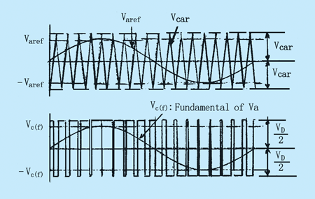 為產(chǎn)生任意波形的交流電壓,將PWM技術(shù)應(yīng)用到直流母線電壓斬波的電壓源逆變器上?,F(xiàn)有很多能組成正弦波或任意波形的PWM技術(shù),利用PWM技術(shù),不僅允許控制逆變器作為電壓源,也可作為電流源以控制濾波器的交流輸出。圖2為所利用的最普通的三角載波(TC)技術(shù),這是最簡單的線性控制方法,是將有固定幅值的和固定三角波的輸出電流誤差進行比較。迫使開關(guān)周期內(nèi)的輸出電壓Va限定于Vcar的載波周期內(nèi),并等于調(diào)制波Varef的平均幅值。正弦調(diào)制波的合成電壓含正弦基波分量Va(f)和不希望的諧波分量,利用盡可能高的頻率載波,可使這些不想要的諧波成分減到最小,但這取決于半導體功率器件(IGBT、GTO或IGCT)的最大開關(guān)頻率。