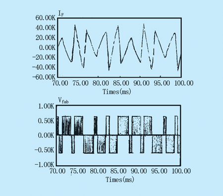 帶自控直流母線的并聯(lián)APF,有一類似于靜態(tài)補償器(STATCOM)的拓撲,STATCOM是用于電力系統(tǒng)中補償無功功率的。并聯(lián)的APF,以注入相等而反向的諧波電流對負荷電流的諧波進行補償。此時,并聯(lián)APF是作為注入諧波分量的電流源而工作的,諧波分量由負荷產(chǎn)生,但已移相180o。圖4為并聯(lián)APF的接線圖,圖5表示APF補償?shù)墓ぷ髟?。為能輸出圖5所示濾波器電流波形的IF,需要設(shè)置圖4中的控制電路,以便產(chǎn)生圖6所示的Vfab脈寬調(diào)制電壓圖。