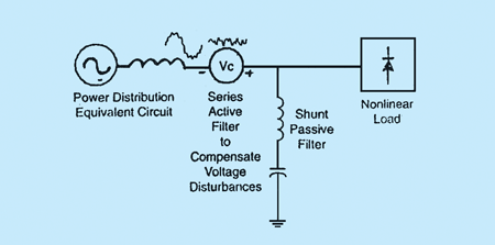 串聯(lián)型APF是從1980年未引用于電網(wǎng)的,它主要作為電壓調(diào)節(jié)器及電網(wǎng)與非線性負荷之間的諧波隔離器而工作的。圖7為串聯(lián)APF的接線圖,通過匹配變壓器將APF串聯(lián)于電源和負荷之間,以消除電壓諧波、平衡或調(diào)正負荷的端電壓,可確保用戶供電的電壓質(zhì)量,尤其適合于補償交流電源及小功率應(yīng)用中的電壓不平衡與電壓的下陷。因不需能量貯備(蓄電池),元器件的總定額較小,對UPS更為經(jīng)濟有效。串聯(lián)APF注入與電源電壓串聯(lián)的電壓分量,故可視為一可控的電壓源,補償負荷側(cè)的電壓下陷和上凸。但串聯(lián)型APF損耗較大,且各種保護電路也較復雜,故很少單獨使用。經(jīng)常用它與無源LC濾波網(wǎng)絡(luò)組成混合型APF。