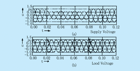 如圖7所示,無源LC濾波器與負荷并聯(lián),串聯(lián)型APF的工作如同一臺諧波隔離器,迫使負荷電流諧波主要通過無源濾波器循環(huán),而不經(jīng)過配電系統(tǒng)。此方案的優(yōu)點是:串聯(lián)APF的額定功率僅為負荷定額(KVA)的一小部分,通常為5%。但在電壓補償時,串聯(lián)APF的視在功率定額可能增加。圖8是串聯(lián)濾波器為補償負荷側(cè)電壓諧波的工作原理圖。串聯(lián)APF還可用于抗基波電壓的干擾。圖9所示為電源電壓偶然跌落時串聯(lián)APF所起的作用。如圖8所示,負荷電壓幾乎保持恒定,僅在電源電壓跌落的起始和最后瞬間,出現(xiàn)了很小的不穩(wěn)定和振蕩。