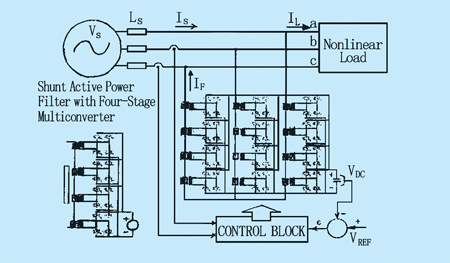 一直處于研究階段的多級逆變器,最近被用于APF拓撲中,圖11為配有三級逆變器的并聯(lián)APF,今天在大多數(shù)的逆變器應(yīng)用領(lǐng)域,三級逆變器已愈益普及,例如功率因數(shù)補償器。多級變換器的優(yōu)點是能降低APF產(chǎn)生的諧波含量。因與普通變頻器比較,能輸出更多(>2級)的電壓,這一特點有利于減少濾波器本身產(chǎn)生的諧波。另一優(yōu)點是能減少半導體電壓或電流的定額,以及減少所需的開關(guān)頻率。