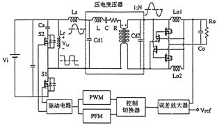 日本的研究人員開發(fā)成功一種振動型壓電變壓器,其厚度僅為4mm。該壓電變壓器的驅(qū)動電路采用方波逆變器,通過改變其開關頻率(PFM方式)以達到借助壓電變壓器的諧振特性來調(diào)整輸出電壓的目的。但是,由于壓電變壓器具有多種由其形狀所決定的諧振頻率,所以很難通過大幅度地改變頻率的做法來控制輸出電壓。為此,人們正在研究引入逆變器的脈寬調(diào)制(PWM)技術。圖7示出了通過將驅(qū)動用逆變器、采用電流倍增器的整流電路以及采用PFM和PWM方式的混合控制電路與壓電變壓器相連而構(gòu)成的壓電變壓器DC/DC轉(zhuǎn)換器。