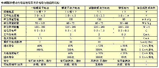 磷酸鐵鋰動(dòng)力電池主要性能列于表1。為了與其他可充電電池的相比較,也在表中列出其他種類(lèi)可充電電池性能。這里要說(shuō)明的是,不同工廠生產(chǎn)的磷酸鐵鋰動(dòng)力電池在各項(xiàng)性能參數(shù)上會(huì)有一些差別;另外,有一些電池性能未列入,如電池內(nèi)阻、自放電率、充放電溫度等。