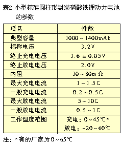 磷酸鐵鋰動(dòng)力電池的容量有較大差別,可以分成三類(lèi):小型的零點(diǎn)幾到幾毫安時(shí)、中型的幾十毫安時(shí)、大型的幾百毫安時(shí)。不同類(lèi)型電池的同類(lèi)參數(shù)也有一些差異。這里再介紹一種目前應(yīng)用較廣的小型標(biāo)準(zhǔn)圓柱形封裝的磷酸鐵鋰動(dòng)力電池的參數(shù)。其外廓尺寸:直徑為18mm、高650mm(型號(hào)為18650),其參數(shù)性能如表2所示。
