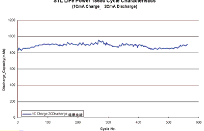 STL18650的充放電循環(huán)壽命曲線(xiàn)如圖4所示。其充放電循環(huán)的條件是:以1C充電率充電,以2C放電率放電,歷經(jīng)570次充放電循環(huán)。從圖4的特性曲線(xiàn)可看出,在經(jīng)過(guò)570次充放電循環(huán),其放電容量未變,說(shuō)明該電池有很高的壽命。