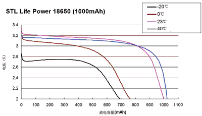 容量為1000mAh的STL18650在不同的溫度條件下(從-20~+40℃)的放電曲線(xiàn)如圖3所示。如果在23℃時(shí)放電容量為100%,則在0℃時(shí)的放電容量降為78%,而在-20℃時(shí)降到65%,在+40℃放電時(shí)其放電容量略大于100%。
