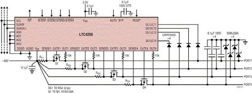 圖1a:采用LTC4258實現(xiàn)的符合基本802.3af標(biāo)準(zhǔn)的PSE電路