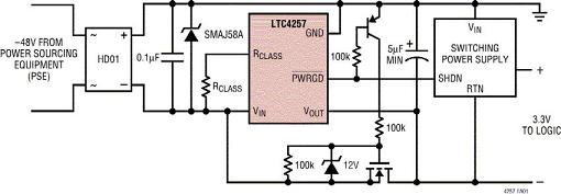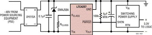 圖1b:采用LTC4257實現(xiàn)的符合基本802.3af標(biāo)準(zhǔn)的PD電路。
