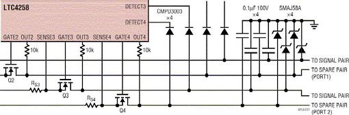 要改變每個通道的其它兩個元件,以處理額外的電流。典型情況下,MOSFETQ4要用較大的器件取代,以在電流限制期間承受更大的功率。在這種應(yīng)用中,采用D2PAK封裝的IRF530類器件就足夠了。此外,也要指定PoE數(shù)據(jù)磁性模塊以承載更高的電流。幾家磁性元件供應(yīng)商最近推出了具有足夠電流能力的器件。