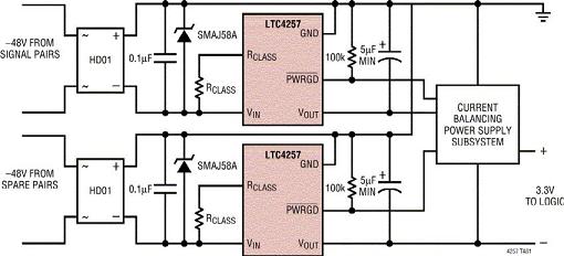 四對PD電路是最大的變化(圖4b)?,F(xiàn)在需要采用兩個LTC4257器件,電源電路必須具備足夠的智能,以便把從每一個通道吸取的電流限制在802.3af規(guī)范容許的范圍之內(nèi)。要做到這一點,就要平衡從每一對線吸取的電流或平衡從每一對線吸取的功率,直到它接近(但是不超過)ICUT極限,然后,才從其它線對吸取電流。這種電路可能相當(dāng)復(fù)雜,不同的設(shè)計之間差異也很大。