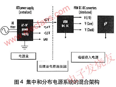 可以用集中和分布單元的組合設(shè)計電源系統(tǒng),如圖4所示的混合電源系統(tǒng)。集中電源產(chǎn)生5.0V和3.3V邏輯電源(其輸入為ac線)以及分布到電壓穩(wěn)壓器模塊(VRM)的12Vdc電平。用VRM為高性能處理器提供很大電流、低電壓芯核和I/O電壓。VRM電源變換器放置在母板靠近處理器的“負(fù)載點”處,這可減少電路板跡線電壓降,在不同的情況下,跡線電壓降對于有效的變換器工作是不能接受的。