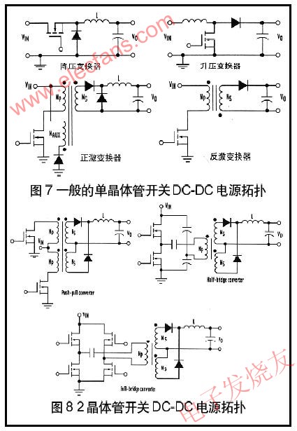 單晶體管拓?fù)?圖7),如降壓、升壓、正激、反激是在分布系統(tǒng)(高達(dá)100W)中設(shè)計用于相當(dāng)?shù)凸β守?fù)載的dc-dc變換器。降壓和升壓電路是非隔離的,而正激和反激變換器提供變壓器隔離。