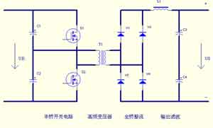 DC/DC功率變換器采用半橋電路拓?fù)?,功率器件少,控制?jiǎn)單,可靠性高。如圖5所示,采用MOSFET和IGBT并聯(lián)技術(shù),充分利用了MOSFET開關(guān)速度快和IGBT導(dǎo)通壓降低的優(yōu)點(diǎn)。在電路上采取措施,使得MOSFET的關(guān)斷時(shí)間比IGBT延遲一定的時(shí)間,大大減小了IGBT的電流拖尾,降低了開關(guān)通態(tài)損耗,提高了效率和可靠性,使得半橋電路的輸出功率可以實(shí)現(xiàn)7kW。其輸出側(cè)采用的整流方式有半波整流,中心抽頭全波整流及全橋整流。由于輸出電壓較高,全橋整流對(duì)變壓器利用率高,比較適合用于這種場(chǎng)合。