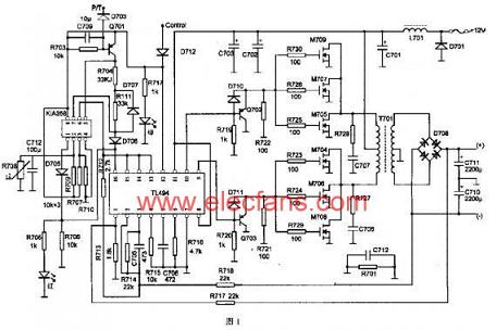不同音響所需電壓高低不同,可適當(dāng)改變初、次級(jí)線圈圈數(shù),及取樣電阻R717和R718阻值來(lái)獲取所需合適電壓。功率整流器不能采用普通整流二極管,由于開(kāi)關(guān)電源工作于高頻狀態(tài),故整流器應(yīng)采用高效快速恢復(fù)二極管、超快速恢復(fù)二極管或肖特基勢(shì)壘整流二極管等。