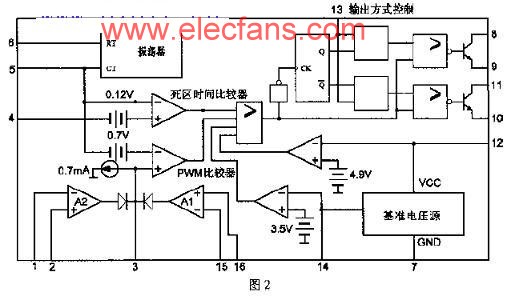 死區(qū)時(shí)間由4腳電壓來(lái)設(shè)定,范圍為0~3.3V之間。誤差放大器A1作為輸出電壓取樣誤差放大,結(jié)果通過(guò)PWM比較器控制脈寬使輸出電壓穩(wěn)定。誤差放大器A2作為保護(hù)控制用,15腳接參考電壓5V(由14腳提供),16腳為控制輸入。在開(kāi)機(jī)保護(hù)、過(guò)溫或過(guò)流保護(hù)時(shí),16腳為高電平,這時(shí),誤差放大器A2輸出高電平,該電平高于振蕩器三角波電平幅值,而使驅(qū)動(dòng)器沒(méi)有驅(qū)動(dòng)脈沖輸出,負(fù)載安全停電。