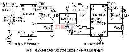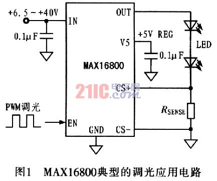 圖1為MAXl6800典型的調(diào)光應(yīng)用電路。MAXl6800具有高輸入電壓范圍(達(dá)40V),可直接連接到汽車電池而不需要保護(hù)器件,保護(hù)器件一般用來(lái)抵御電池負(fù)載變化帶來(lái)的浪涌電壓。MAxl6800能夠?yàn)長(zhǎng)ED提供恒定電流,電流值可以通過與LED串聯(lián)的檢流電阻RSENSE設(shè)置。為了提高電流設(shè)置精度,提高對(duì)外部噪聲的抑制能力,MAXl6800采用差分電流檢測(cè)輸入方式。