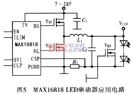 需要較高照明功率的場(chǎng)合,如泛光燈或霧燈,必須使用超高亮度LED(HBLED)。HBLED需要較高的驅(qū)動(dòng)電流,前面討論的產(chǎn)品無(wú)法提供低成本設(shè)計(jì),需要過多的驅(qū)動(dòng)器產(chǎn)生所需的電流。最好采用能驅(qū)動(dòng)大電流功率管的控制器,大電流功率管可以為HBLED提供高達(dá)30A的電流,MAXl6818可以滿足這種設(shè)計(jì)要求,如圖5所示。