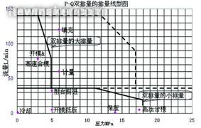 但其變量特性可用來降低對(duì)伺服電機(jī)的扭矩負(fù)載,故降低其電流及其發(fā)熱,使在需要極低流量的保壓,保壓時(shí)間能夠更長(zhǎng)。這在油研公司的雙排量設(shè)計(jì)發(fā)揮了出來。從下圖得知,保壓及高壓合模所需的流量低但壓力高,可將變量泵轉(zhuǎn)為小排量,降低在低速時(shí)伺服電機(jī)的大電流產(chǎn)生的發(fā)熱。此功能連全電機(jī)也做不到。如不用雙排量的話,保壓及高壓合模會(huì)超越原排量的壓力流量范圍,但仍在虛線的超載范圍內(nèi),可以作短暫保壓及高壓合模。如鎖模方法是采用機(jī)鉸,高壓合模自然是短暫的。直壓鎖模如不采用單向閥將鎖模力鎖住,便要靠電機(jī)油泵不停地工作來維持鎖模力。雙排量的小排量能提供長(zhǎng)時(shí)間的保壓及高壓合模。