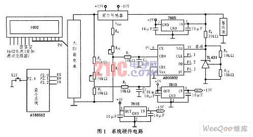 單片機(jī)正常運(yùn)行需要為片內(nèi)的晶體管或場效應(yīng)管供給電源,使其工作在相應(yīng)狀態(tài)。AT89S52需要一個5V電源(實際工作電壓為3.6~6.0V)??捎谜鳌⒎€(wěn)壓方式供電,獲得4.5V左右的電壓,因本系統(tǒng)為獨(dú)立發(fā)電,且長期使用,考慮到電源壽命,該裝置由市電或干電池提供驅(qū)動電源不符合實際,所以最佳方案應(yīng)該由系統(tǒng)內(nèi)部太陽能電池的蓄電池供電,經(jīng)穩(wěn)壓集成塊7805穩(wěn)壓為5V,輸入單片機(jī)Vcc引腳,驅(qū)動單片機(jī)及液晶顯示裝置。TBCl0SY霍爾電流傳感器,需±15V雙電源供電,同樣采用系統(tǒng)內(nèi)的蓄電池供電.經(jīng)穩(wěn)壓集成塊7805、7915穩(wěn)壓在±15V,從而驅(qū)動其工作。