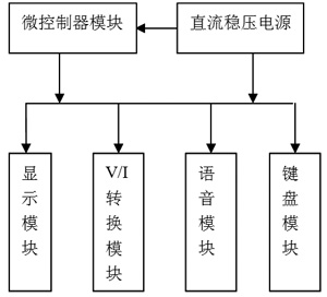 本設(shè)計(jì)采用單片機(jī)作為主要控制部件,通過(guò)鍵盤(pán)預(yù)置輸出電流值并采用液晶模塊實(shí)時(shí)顯示。整個(gè)系統(tǒng)硬件部分由微控制器模塊、電壓-電流轉(zhuǎn)換模塊、鍵盤(pán)模塊、顯示模塊、直流穩(wěn)壓電源模塊和語(yǔ)音提示模塊組成。系統(tǒng)結(jié)構(gòu)框圖如圖1所示。