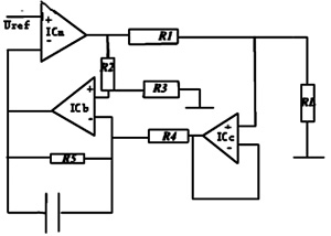 電壓-電流轉(zhuǎn)換模塊的組成還有另外一種方案,采用3個(gè)運(yùn)放構(gòu)成輸出電流可變的電流源,如圖3所示。輸出電流I=Vi/R1,為使R1兩端的電壓保持恒定,由差分放大器IC1b通過(guò)射隨器IC1c監(jiān)測(cè)R1兩端的電位,此電位經(jīng)IC1b的7腳加到比較器ICa的反相輸入端與Vref比較。比較結(jié)果使比較器的輸出端變化,直到平衡為止,即Vr1=Vi。電路中的電容用于補(bǔ)償ICa的頻率,減少控制環(huán)路的延時(shí)。只要R1=R2=R3=R4=R5,此電路的性能較好。但此電路的帶負(fù)載能力不強(qiáng),環(huán)路延時(shí)補(bǔ)償對(duì)電路的穩(wěn)定有較大影響。