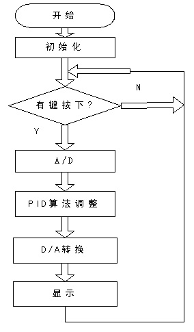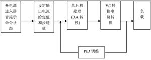在工作過(guò)程中,SPCE061A單片機(jī)將被預(yù)置的電流值通過(guò)換算進(jìn)行D/A轉(zhuǎn)換,以輸出電壓驅(qū)動(dòng)V/I轉(zhuǎn)換電路實(shí)現(xiàn)電路輸出,并將該電流值對(duì)應(yīng)的電壓值通過(guò)閉環(huán)回路,經(jīng)A/D轉(zhuǎn)換后輸入單片機(jī)系統(tǒng),再通過(guò)PID算法調(diào)整電流輸出。整個(gè)系統(tǒng)工作流程圖如圖4所示。