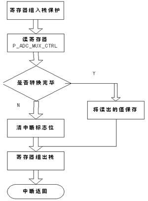 A/D轉(zhuǎn)換部分程序主要用于將采樣電阻采到的模擬電壓信號(hào)轉(zhuǎn)換為數(shù)字信號(hào)。采樣信號(hào)由IoA6輸入并直接送入緩沖器P_ADC_MUX_Data,在ADC自動(dòng)方式被啟用后,會(huì)產(chǎn)生一個(gè)啟動(dòng)信號(hào),此時(shí),RDY=0,DAC0的電壓模擬量與外部的采樣模擬比較,以盡快找出外部信號(hào)模擬量的數(shù)字量,A/D轉(zhuǎn)換的結(jié)果保存在SAR內(nèi)。當(dāng)10位A/D轉(zhuǎn)換完成時(shí),RDY=1,此時(shí),通過(guò)讀P_ADC_MUX_Data單元可以獲得10位A/D轉(zhuǎn)換的數(shù)據(jù)。其IRQ1中斷服務(wù)程序的流程圖如圖6所示。