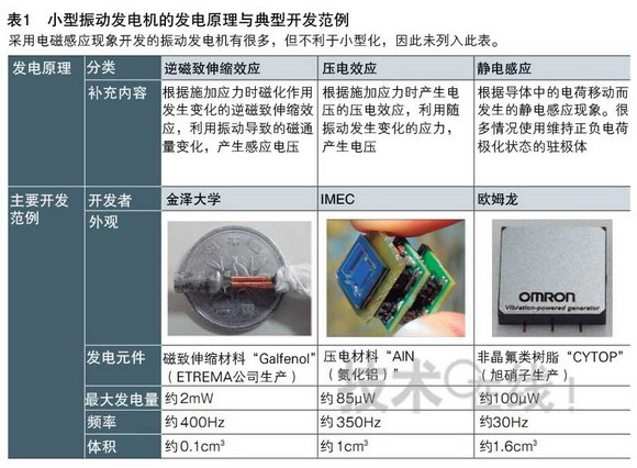 日本金澤大學(xué)上野敏幸副教授開發(fā)出了尺寸雖小卻可獲得較大發(fā)電量的振動發(fā)電機(jī)。盡管外形尺寸僅為約2mm×3mm×12mm,但振動頻率達(dá)到約400Hz時卻可獲得約2mW的發(fā)電量(表1)。