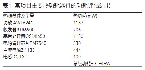 終端平臺的熱源器件主要有基帶芯片、射頻芯片、功放、電源管理芯片等,這些器件的功耗有的可以從廠商給的datasheet中查到,有的查不到,對于從datasheet中查不到功耗數據的熱源器件,需要根據經驗或同類項目的測試數據進行估算,還可以直接向平臺提供商索取相關數據。表1為某項目主要熱功耗器件的功耗評估結果。